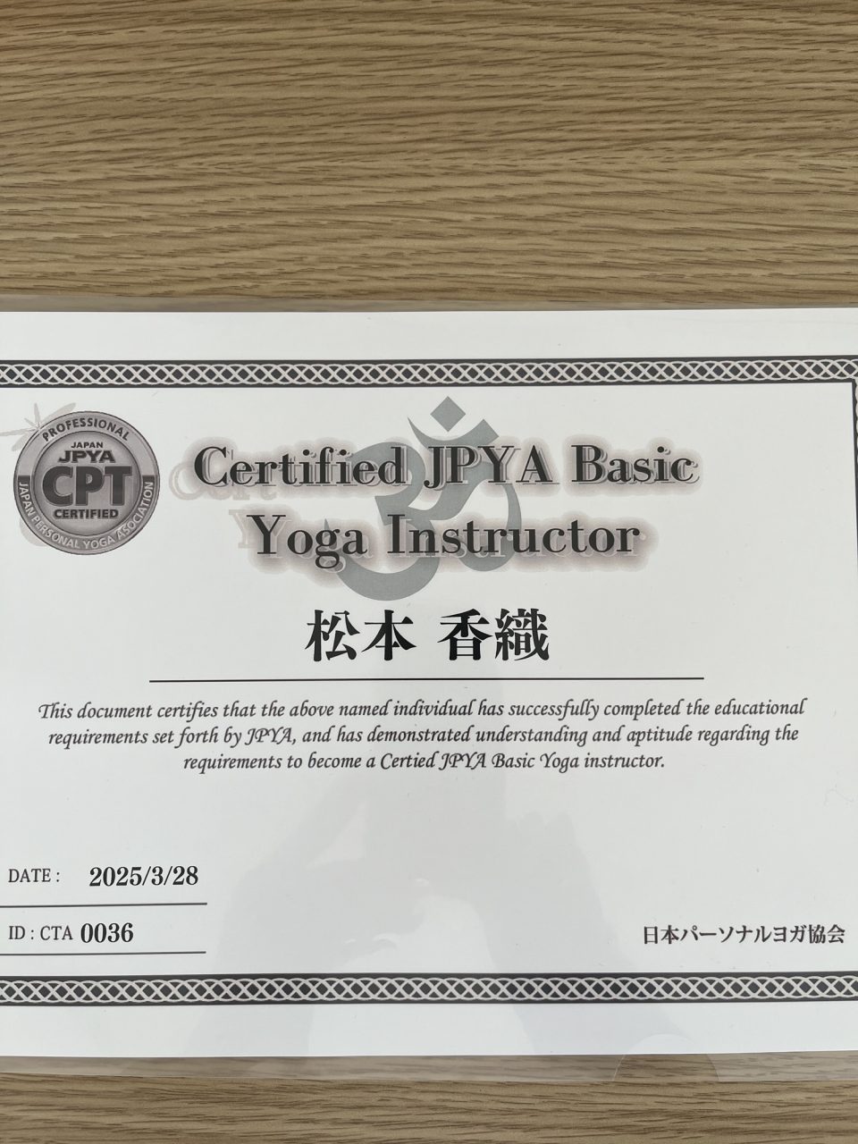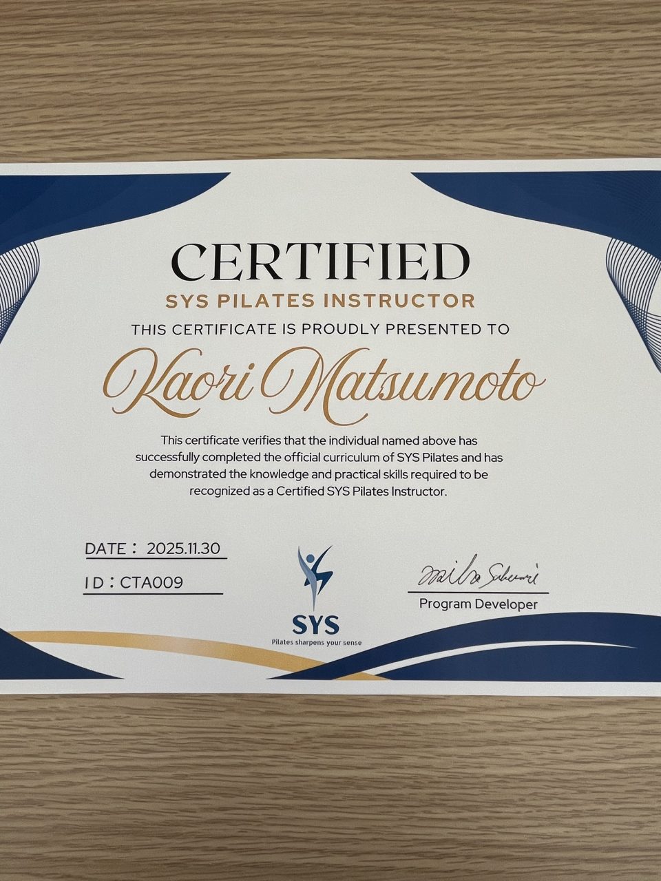 この度、講師の松本香織は、SYSピラティスの指導資格とJPYA日本パーソナルヨガ協会 パーソナルヨガトレーナーベーシックの資格を取得致しました。